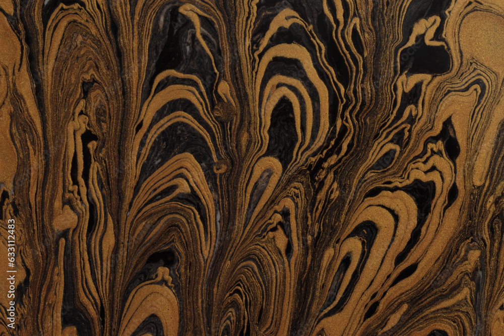 Art flow pour oil and acrylic color painting blot. Abstract liquid swirl black and gold texture background.