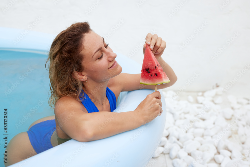 a girl in a bathing suit swims in the pool in a hot summer, a girl with a watermelon