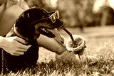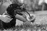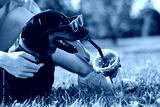dachshund dog in sunglasses on a hot day drinks a refreshing cocktail, hot summer concept