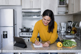Latin adult woman cooking and writing recipe in a notebook in kitchen at home in Mexico, Hispanic female preparing mexican food in Latin America
