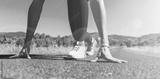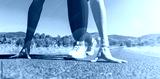 Athlete woman in running start pose on the road- Sport clothes, sunlight style and blurry background- sport,active,determination concept