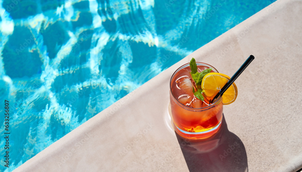 Refreshing cocktail by the pool on a sunny day, the perfect summer vacation. View from above with space for your text