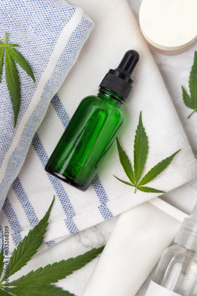 Green glass dropper bottle near green cannabis leaves top view, CBD cosmetic mockup