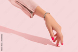 Womans hand with pink nail design. Manicure, pedicure beauty salon concept. Trendy color