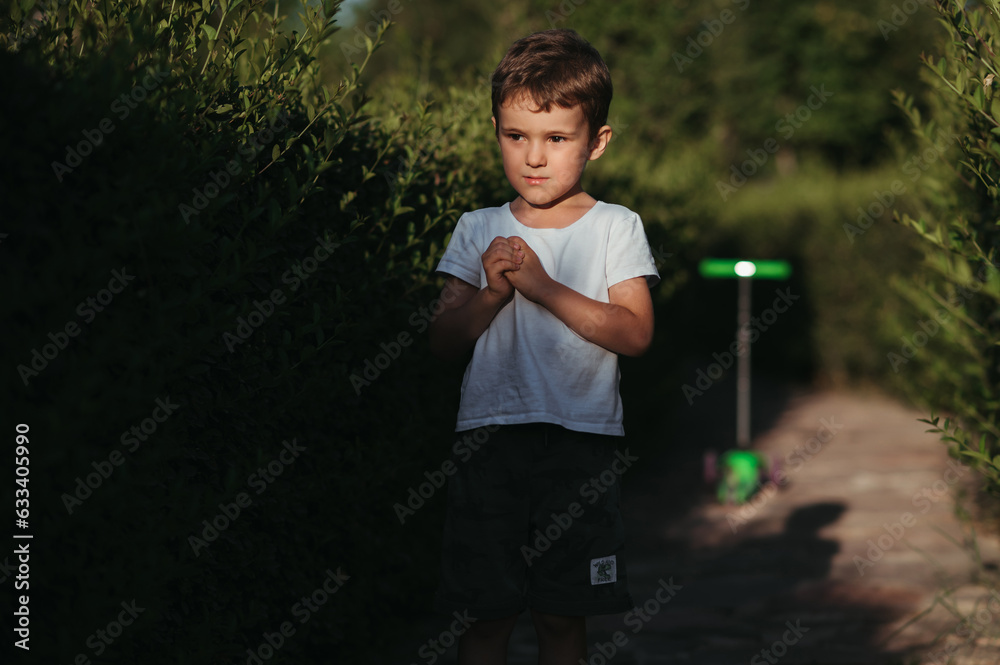 portrait of a kindergarten boy walking in the park in summer