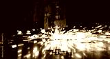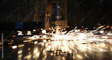 Sparks fly out machine head for metal processing laser metal on metallurgical plant background. Manufacturing finished parts for automotive production concept