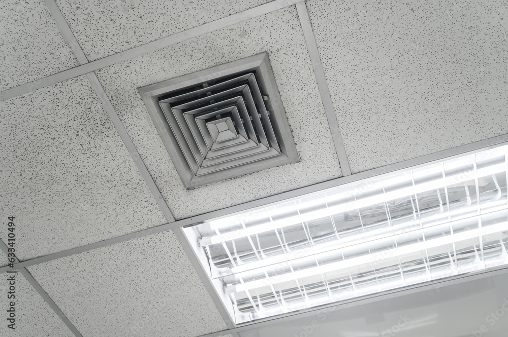 Ceiling mounted cassette type air conditioner and modern lamp light on white ceiling. Duct air conditioner for home, hall or office.