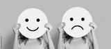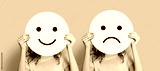 happy unhappy concept. two girls holding posters with happy and sad emotion