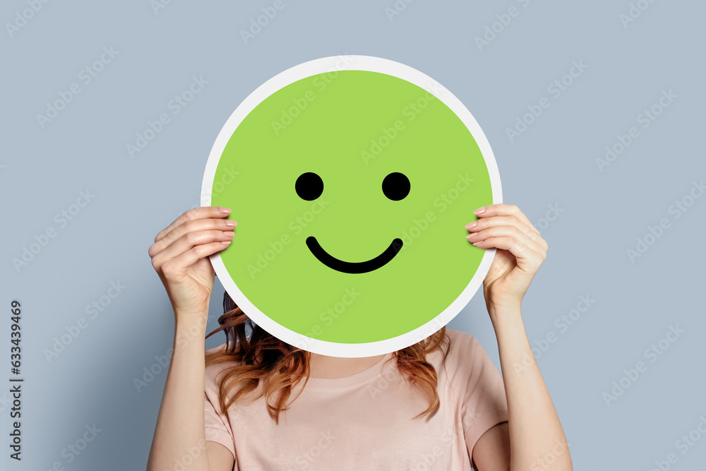 Girl holding a paper poster with a happy cheerful smiley