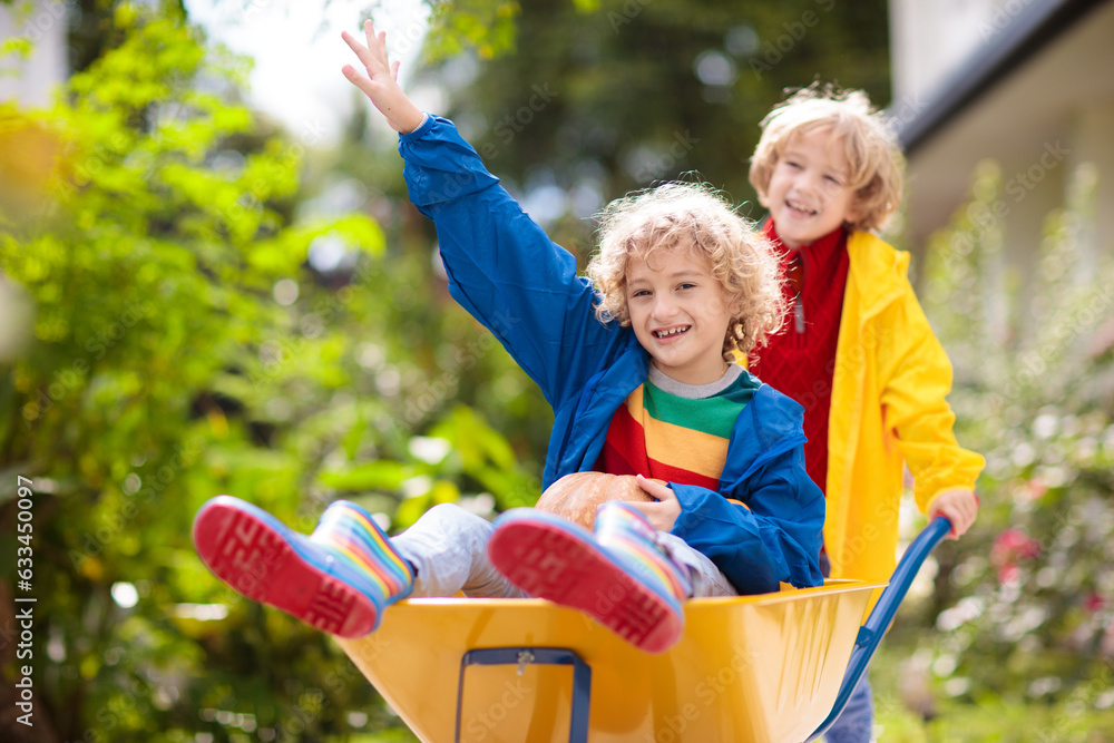 Kids on pumpkin patch. Child autumn outdoor fun.