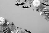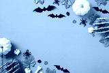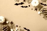 Halloween banner design. Flat lay pumpkins, spiders, bats, maple leaves on orange background.