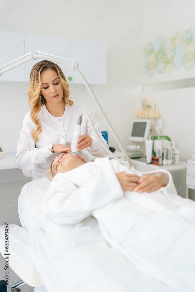 Vertical shot of laser rejuvenation technology for female patient using cosmetic handpiece for radiofrequency body skin lifting at cosmetology in beauty clinic. Concept of anti-age rejuvenation.