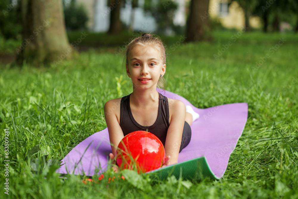 Rhythmic gymnastics. Preteen child gymnast performs an exercise with ball on sport mat.