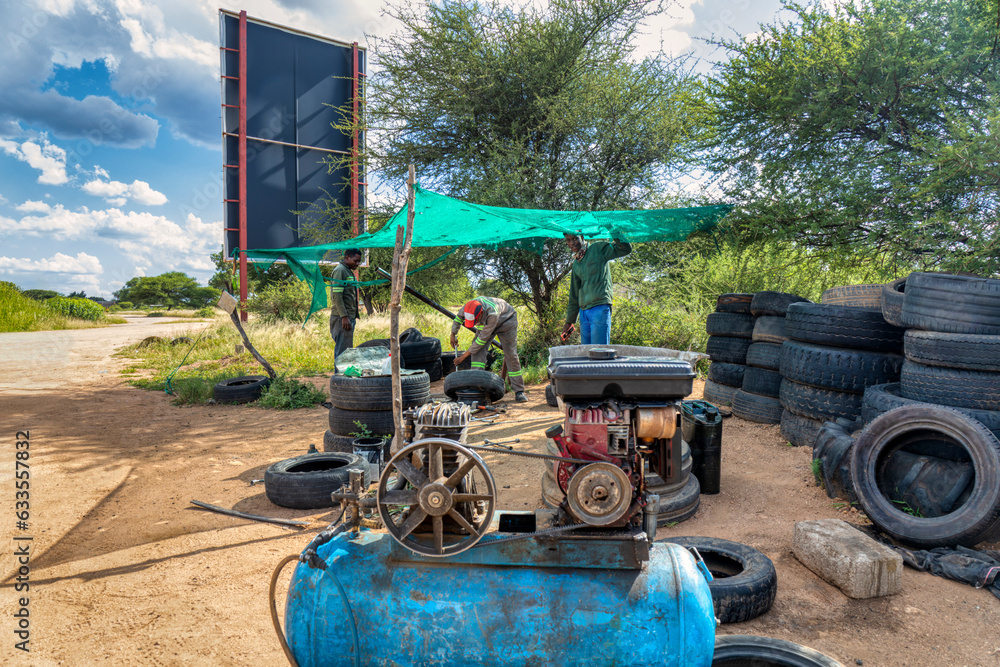 african men, street hustlers behind a compressor, fixing and inflating tires for a living, team of working entrepreneurs in workwear on the side of the dirt road
