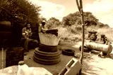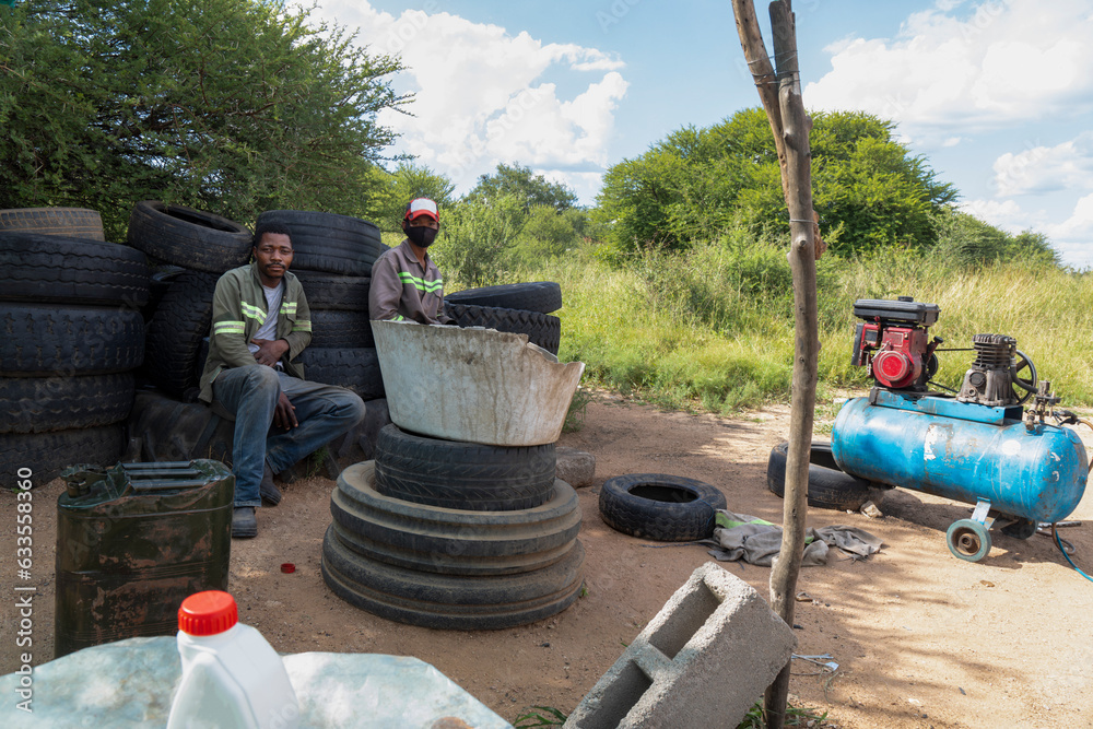 african american street hustlers behind a compressor, fixing and inflating tires for a living, team of workers in workwear
