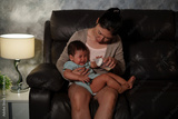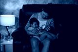 stressed mother trying to feeding milk bottle to crying infant baby on sofa in the living room at night