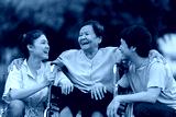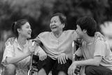 happy grandson and granddaughter talking with senior woman in wheelchair at park