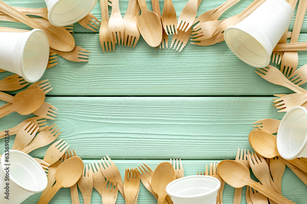 Frame of wooden eco friendly cutlery. Zero waste concept