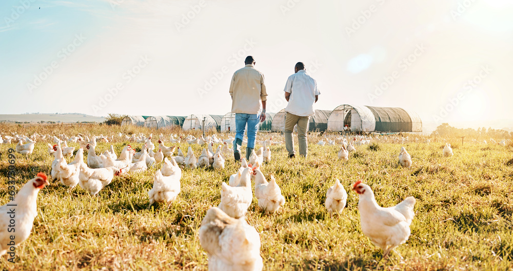 Black people, back and walking on farm with chicken in agriculture together and live stock. Rear view of men working in farming, sustainability and growth for supply chain or crops in the countryside