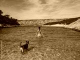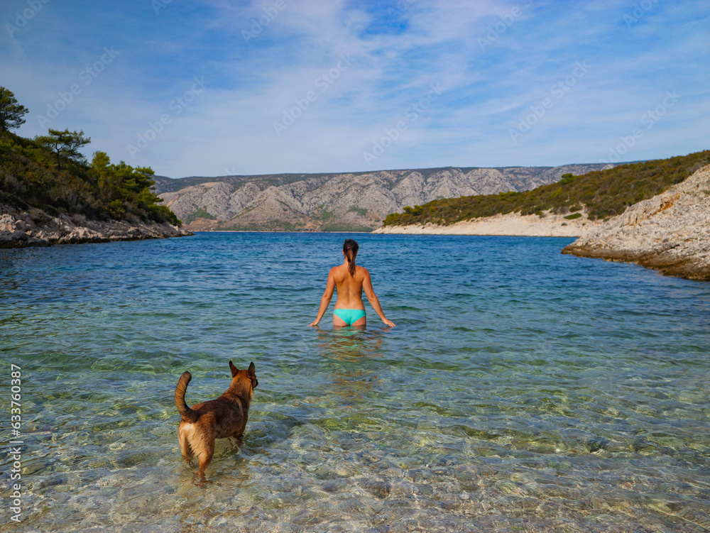 Cute brown dog watches its attractive owner going for a swim into clear blue sea