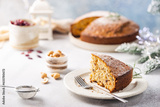 Traditional Christmas cake pudding with fruits and nuts with Christmas decorations, light background