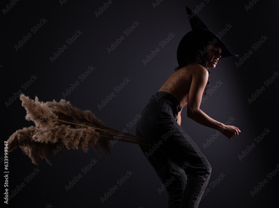 Young witch flying on broom