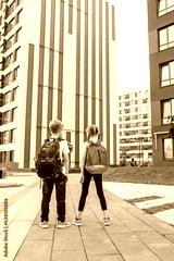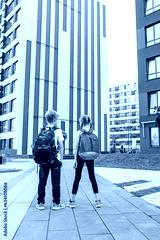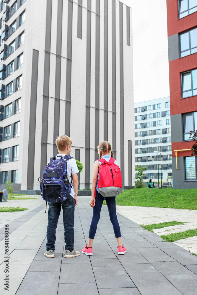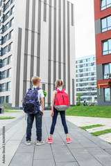 Back to school. Children go to school for study. Beginning of school lessons. Back view. Copy space