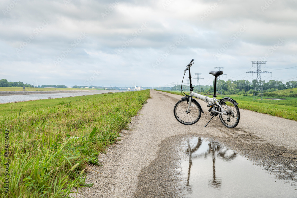 folding bike on a levee trail along Chain of Rocks Canal near Granite City in Illinois