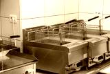 Equipment for deep-frying dishes. Industrial fryers in a restaurant. Stainless steel deep fryers