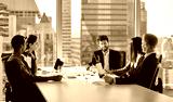 Happy international multiethnic professional business team, diverse executive colleagues people discussing financial project working together in office at group meeting table in corporate board room.