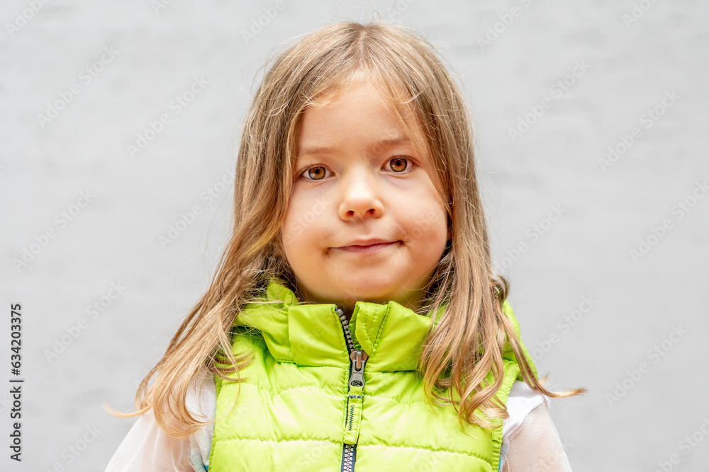 Portrait of a blonde-haired girl of 5 years old in a sleeveless jacket on a light background.