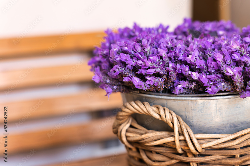 lavender fresh bunch of flowers in a bucked sited in a raffia basket on a bench