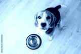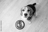 A beagle dog is sitting on the floor, next to an empty bowl. The dog is waiting for feeding. Top view.