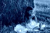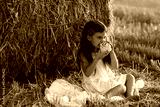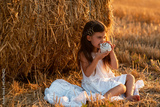 cute little girl of European appearance sitting in white summer dress and eating a bun sitting near a haystack at sunset