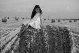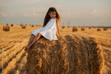A cute little European-looking girl in a white summer dress sits on a bale of hay