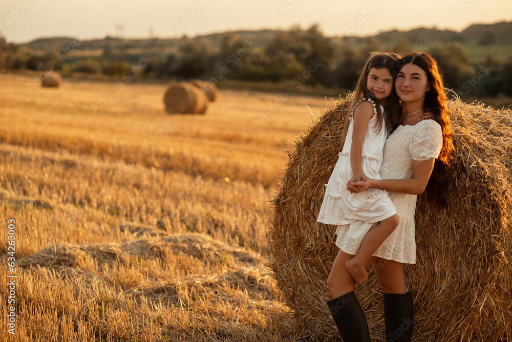 sweet little girl of European appearance hugs her mother tightly at sunset amidst a mowed field of wheat and hay bales