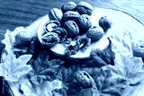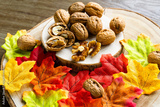 Group of walnuts on a natural wooden tray and some colorful autumn leaves
