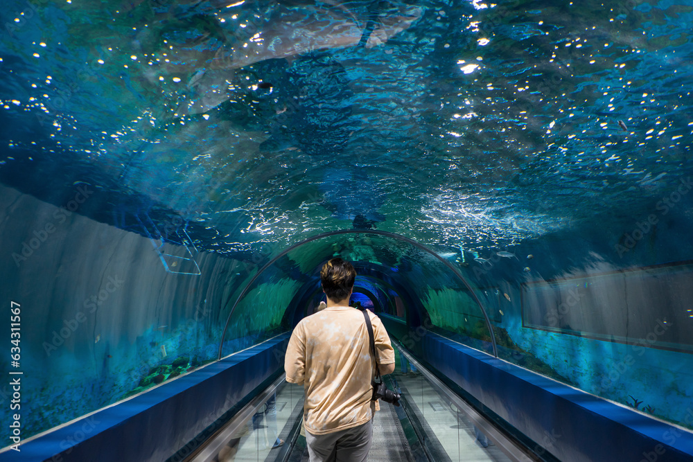 Soft focus of tourist to walk to see world's biological , exports wild-caught and farm-bred aquarium dome fish species to many fishes and other sea creatures.