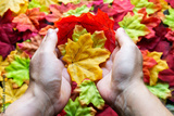 Human hands holding colorful autumn leaves over fallen leaves background.