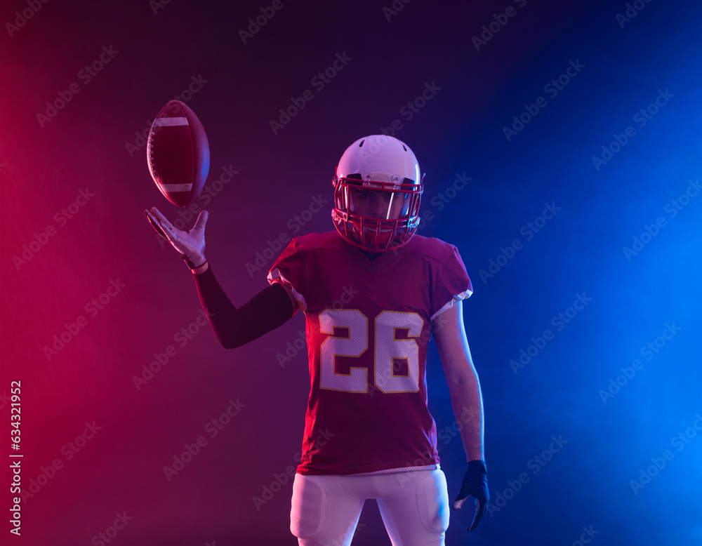 American football player banner with neon lights. Template for a sports magazine on the theme of American football with copy space. Mockup for betting ads.