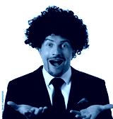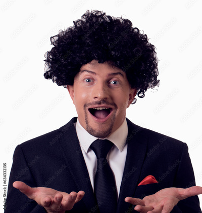 Photo of positive cheerful attractive handsome man pointing at empty space with index finger grinning toothily