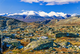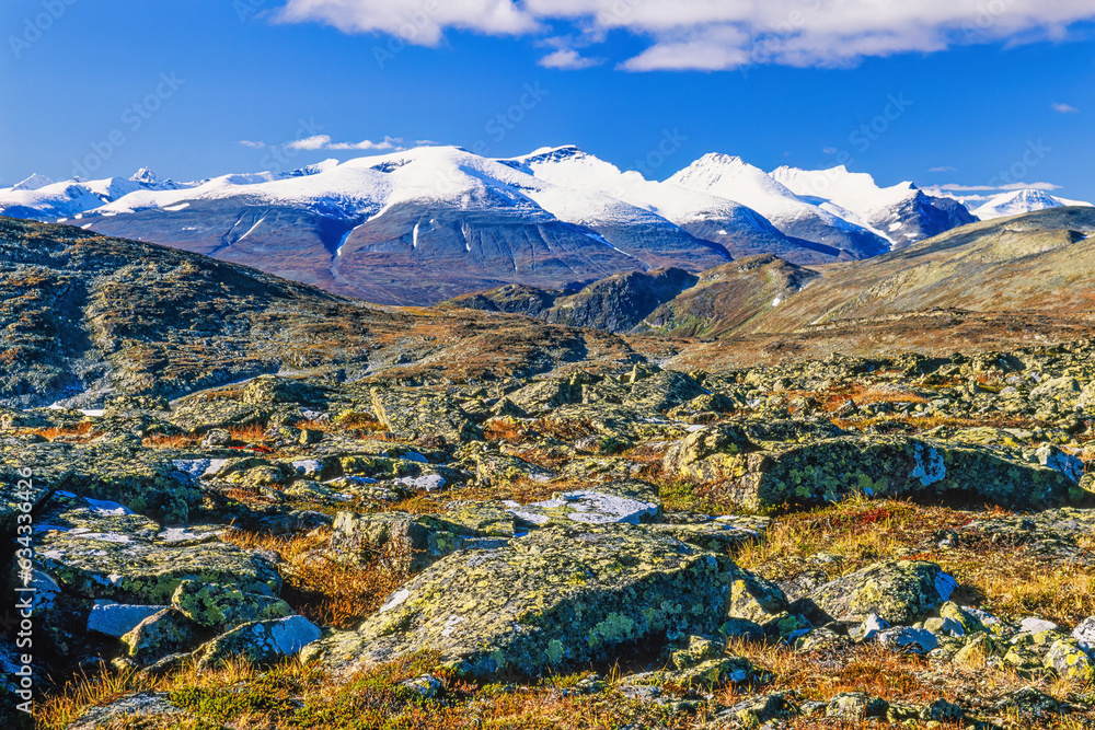 Rocky terrain with snow capped mountain peaks in the north of Scandinavia