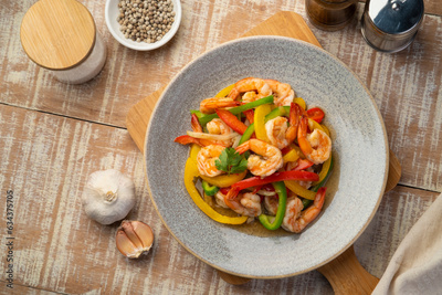 Stir Fried Sweet Peppers with shrimp,Stir fry shrimps and sliced red green and yellow bell pepper with sauce in a plate.healthy food.Top view