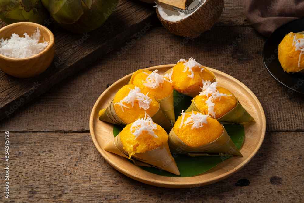 Toddy Palm Cake ,kind of like sponge cake,a little Sweet Yellow Thai cake in Toddy Palm leaf bowl on wooden plate.(Khanom Tan)