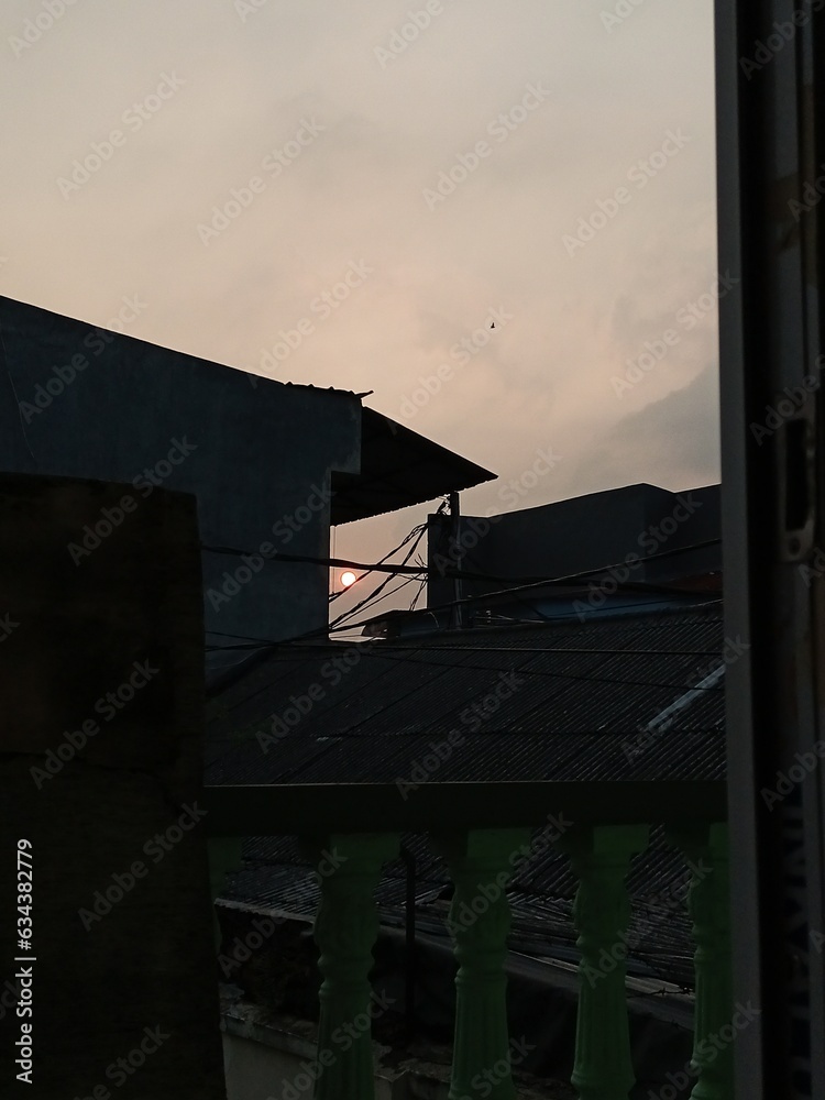 View of the sun in the afternoon. silhouette of buildings at sunset.