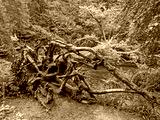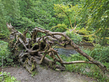 A fallen tree with tangled petrified roots lies across a river forming a bridge. Forest setting in Edenvale, County Wexford, Ireland.