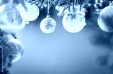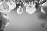 Christmas decoration with white christmas balls and fir tree branches against blurred purple background, copy space for your product or text.