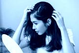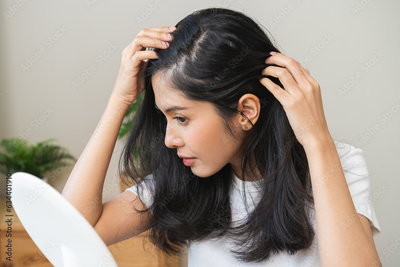 Damaged hair symptom, problem hair fall asian young woman, girl worry about balding, looking at scalp in mirror, hand in break into front hair loss, thin problem. Health care treatment for beauty.