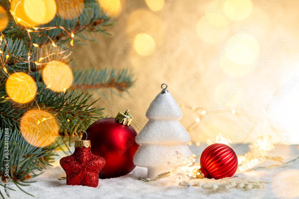 Christmas decorations on a snowy table with fir branches and glowing garlands. Copy space