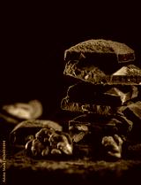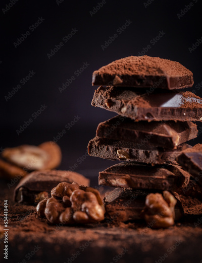 A pile of dark broken chocolate sprinkled with cocoa powder and walnuts on a dark background. Copy space